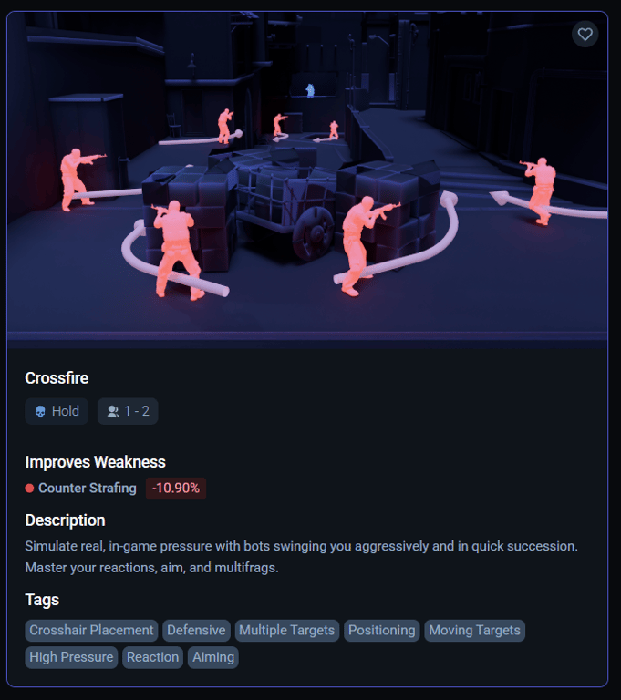 Crossfire is a fun, fast paced game mode where you shoot at bots that peek you with realistic movement from common positions.